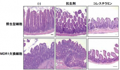 がん研究の分野で多くの研究がなされてきた「生体外物質トランスポーターMDR1」の遺伝子を持たないマウスでは、腸管炎症が自然発症することが知られており、MDR1遺伝子は炎症性腸疾患の発症リスク遺伝子の一つと考えられていました。MDR1は、細胞内に取り込まれた化合物を細胞外へ排出する機能をもちますが、MDR1と相互作用する腸内因子や免疫応答に関しては明らかになっていませんでした。香山助教らの研究グループは、MDR1遺伝子を持たない(MDR1欠損)マウスの免疫細胞を用いて作製した腸管炎症モデルマウスを解析することにより、MDR1が腸管炎症を制御するメカニズムの解明に取り組みました。