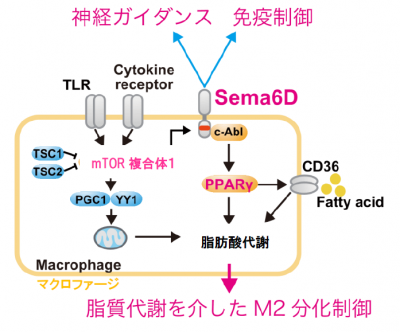 熊ノ郷教授らの研究グループは、これまでに、免疫と代謝に関する研究において、細胞内で生成されたアミノ酸によりmTORを介してM2マクロファージが活性化されることを見出しています。その後、栄養・代謝センサーであるmTORシグナルの下流に何があるのかをマイクロアレイ解析で調べたところ、神経ガイダンス因子と言われているセマフォリン6Dが見つかり、今回、この分子と代謝、免疫の関係を詳しく調べました。