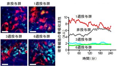 最後に、本研究のライブイメージング技術を薬効評価系として応用し、検討を行いました。骨粗鬆症薬として臨床応用されているものの、その作用機序がよく分かっていない副甲状腺ホルモン(PTH)製剤※4に注目し、生体骨組織内においてPTH製剤が骨芽細胞および破骨細胞に与える影響を解析しました。その結果、PTH製剤を連日投与した群では、薬剤を投与してない群と比較して、骨芽細胞と破骨細胞の細胞間相互作用が有意に増加し破骨細胞の骨を溶かす機能が抑制されていることが明らかとなりました(図4)。これにより、PTH製剤が生体内で骨量を増加させる仕組みが細胞レベルで明らかとなりました。