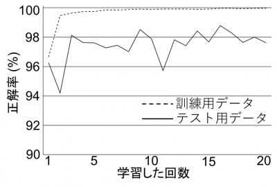 図2. がん細胞画像をもとに細胞種を予測させた際の正解率の推移。 テスト用データ (AIの訓練に用いなかったデータ)においても約98%の正解率が得られた。