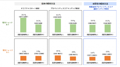 そこで、研究グループは、この蘇生時間バイアスを克服するために、高度気道確保された時間ごと(1分毎)に傾向スコアを算出し、同じタイミングで高度気道確保された群とまだされていない群をマッチさせることで、蘇生時間バイアスを減らそうという手法(時間依存傾向スコア連続マッチング解析)を新たに導入しました。また、心停止患者さんの心電図波形により心室細動がある場合、電気ショックの適応が判断されますが、電気ショックの有無により、その後の救急隊の蘇生処置が異なるために、分けて解析を行いました。