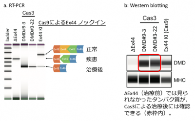さらに、CRISPR-Cas3の遺伝子疾患に対する治療応用として、デュシャンヌ型筋ジストロフィー患者由来iPS細胞に利用した結果、エクソンスキッピング(注3)によりDMDタンパク質の発現が改善することを確認できました。