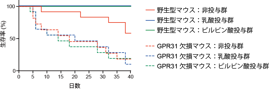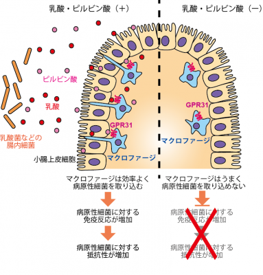 - 乳酸・ピルビン酸の受容体として、小腸マクロファージの細胞表面に発現するGPR31を同定。乳酸・ピルビン酸をマウスに投与すると、マクロファージが活性化し、病原性細菌に対する抵抗性が増加。