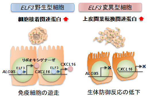 - 上皮細胞において、ELF3にタンパク質の機能が不活化してしまうような変異(不活化変異)が起きた細胞では、上皮系から間葉系へと形態が変わり、浸潤・転移しやすい形質となること、さらに、免疫細胞を呼び寄せる能力が低下することを明らかにした。