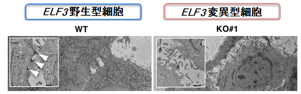 本研究では、ゲノム編集技術※3によりELF3の発現を調節した胆管上皮細胞を用いて網羅的な遺伝子発現解析とクロマチン免疫沈降シーケンス解析※4を行い、ELF3が直接的に転写を制御する遺伝子の探索を行いました。これらの解析から、ELF3のターゲット遺伝子として、上皮間葉転換を担う転写因子である ZEB2および細胞接着に関連する蛋白であるcingulin(シンギュリン)を同定し、ELF3の機能が低下した胆管上皮細胞では、細胞同士の接着を担う構造が乏しいことを電子顕微鏡レベルでも明らかにしました(図2)。またELF3の発現がない細胞では、細胞の浸潤する能力が高く、がんが転移しやすい細胞に形質変化することを示しました。