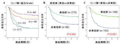 予後に関する検討では、転移リンパ節の治療効果判定gradeによって段階的に成績が異なり(図2A)、また奏効群は非奏効群と比較して生存率が明らかに良いことがわかりました。また、原発巣とリンパ節の病理学的な治療効果による予後曲線を比較すると、転移リンパ節の治療効果判定の方がより顕著に生存率を反映していました(図2B,C)。生存期間における多変量解析※3ではリンパ節の病理学的治療効果判定が独立した予後因子でしたが、原発巣の判定は予後因子にはなりませんでした。また術後の再発形式に関する検討では、原発巣・リンパ節ともに非奏効群では奏効群と比較してリンパ行性再発※4や血行性再発(肺、肝臓、骨など)※5の頻度がそれぞれ高く、その傾向は原発巣よりもリンパ節における治療効果判定で顕著でした。