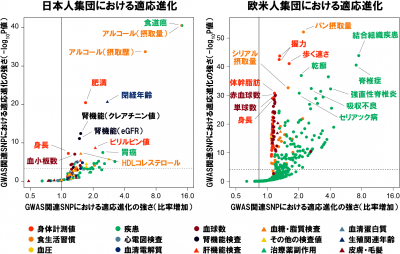 日本人集団では、アルコール摂取量・腎機能・肥満・免疫疾患が適応進化の対象である一方、欧米人集団では、パン摂取量・握力・歩く速さ・背骨の関節炎が対象であることが判明