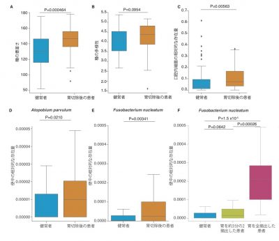 本研究で行った解析では、胃切除後の患者は健常者と比較して、腸内細菌の種の豊富さ(用語7)と種の多様性(用語8)の高さが確認されました(図2 A、B)。これらの違いは、胃切除による腸内環境の変化を反映している可能性があります。その変化の1つとして、胃切除後の患者では、口腔内でよく検出される細菌の相対的な量が多いことが確認されました(図2C)。