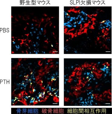 - 今回、PTHが骨に作用すると、骨芽細胞が低分子タンパク質であるSLPI(secretory leukocyte protease inhibitor) ※2を発現し、これが骨を作る骨芽細胞の骨形成機能を上げると同時に、細胞外に分泌されて、破骨細胞との相互作用(カップリング)を制御し、骨を壊す破骨細胞による骨吸収(骨破壊)を抑制することを明らかにした。