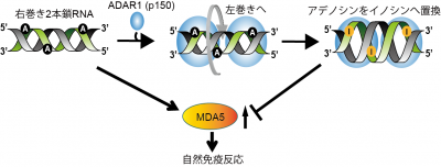 図1. ADAR1を介したRNA編集により2本鎖RNA中のアデノシン(A)がイノシン(I)へと置換されると、この2本鎖RNAはMDA5によって異物と誤認されなくなる。この一連の過程に、ADAR1が2本鎖RNAの一部を右から左巻きに変えることが不可欠であることを発見
