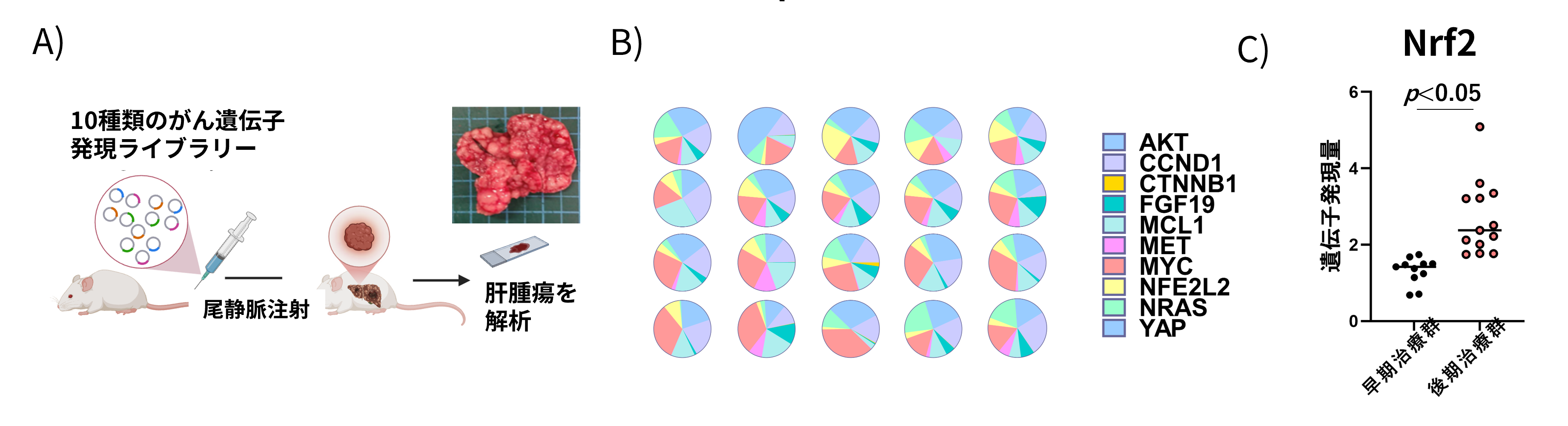 図2: A)10種類のがん遺伝子を尾静脈より急速静注し肝腫瘍を形成、B)各腫瘍内のがん遺伝子の頻度分布は腫瘍毎に異なり、腫瘍間不均一性が認められる、C)複合免疫療法抵抗性腫瘍ではNRF2遺伝子発現が上昇クリックで拡大表示します