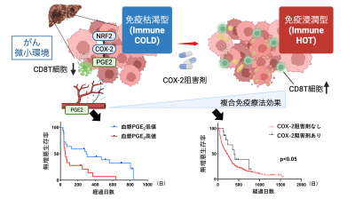 そこで本研究では、遺伝的多様性を再現したマウス肝がんモデル、ヒト肝細胞がん検体、さらに国際臨床試験データを用いた包括的解析を行い、遺伝子異常とがん微小環境、治療抵抗性との関連を調べました。その結果、複合免疫療法に対して治療抵抗性を示す腫瘍では、NRF2およびCOX-2経路が活性化しており、免疫細胞が浸潤しにくいがん微小環境を形成していることがわかりました。さらに、COX-2の代謝産物であるプロスタグランジンE₂(PGE₂)に着目した解析から、治療開始前の血漿PGE₂濃度が高い患者では複合免疫療法の効果が不良なことが分かり、PGE₂が非侵襲的な効果予測バイオマーカーとなる可能性が示されました。また、COX-2阻害剤服用例では非服用例と比較して、複合免疫療法の効果が高いことが示されました。