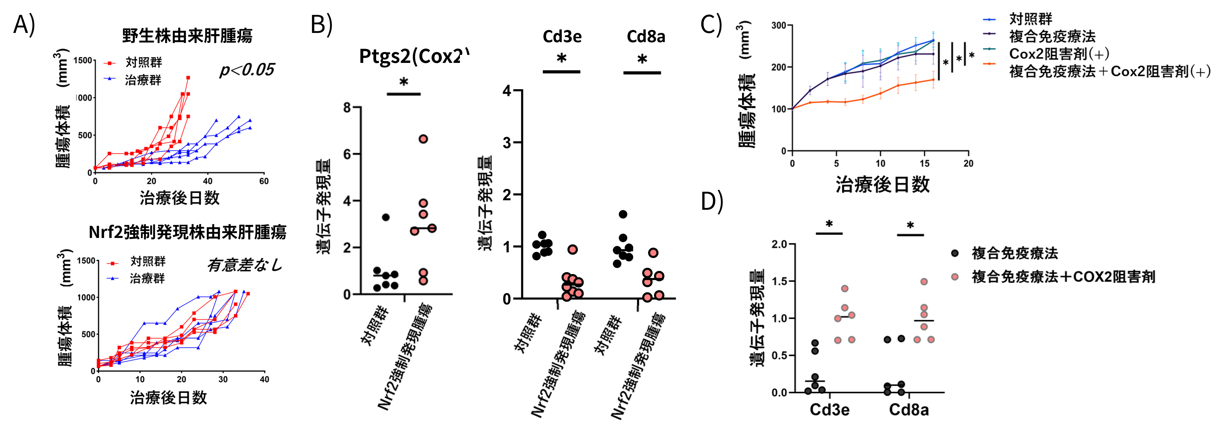 示した、B)Nrf2強制発現腫瘍ではPtgs2(Cox2)遺伝子の発現が上昇し、腫瘍内の免疫細胞(CD3/CD8陽性T細胞)湿潤が減少した、C)複合免疫療法にCOX-2阻害剤を追加する事で、治療抵抗性は消失した、D)COX-2阻害剤投与により腫瘍内の免疫細胞湿潤が