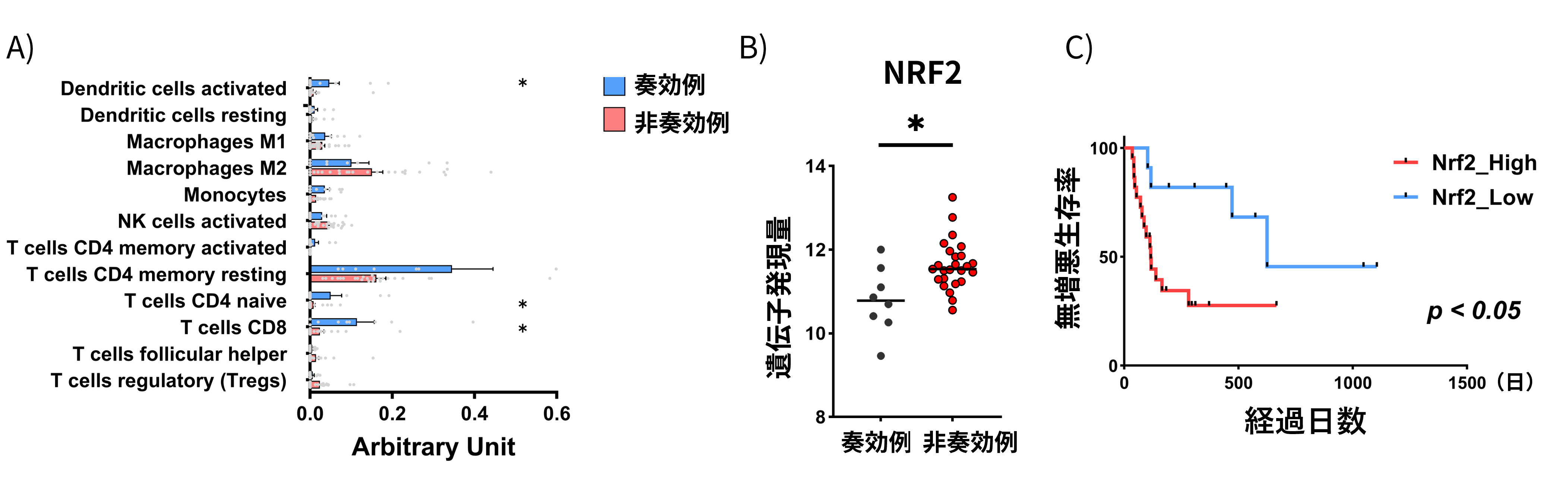 B)非奏効例では奏効例と比較し、NRF2遺伝子発現が高値であった、C)NRF2高発現腫瘍の患者では、複合免疫療法における
