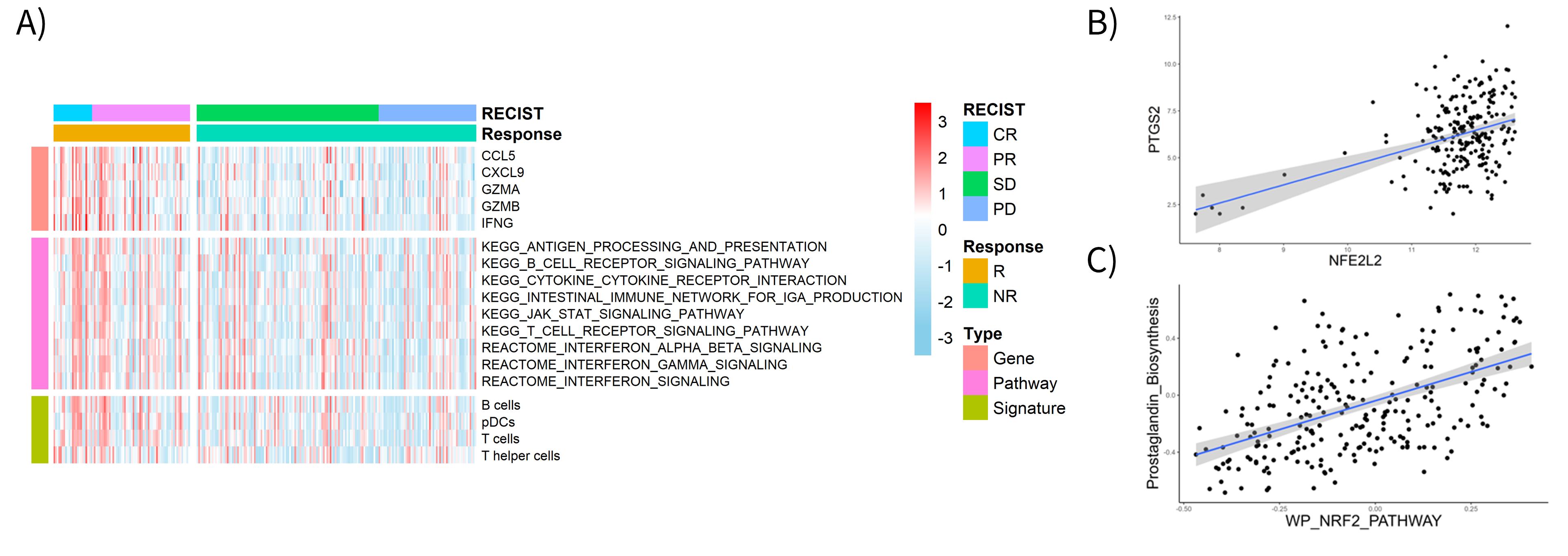 免疫関連のパスウェイの活性化に乏しいがん免疫微小環境を呈した、B)がん組織において、NRF2とPTGS2(COX2)の