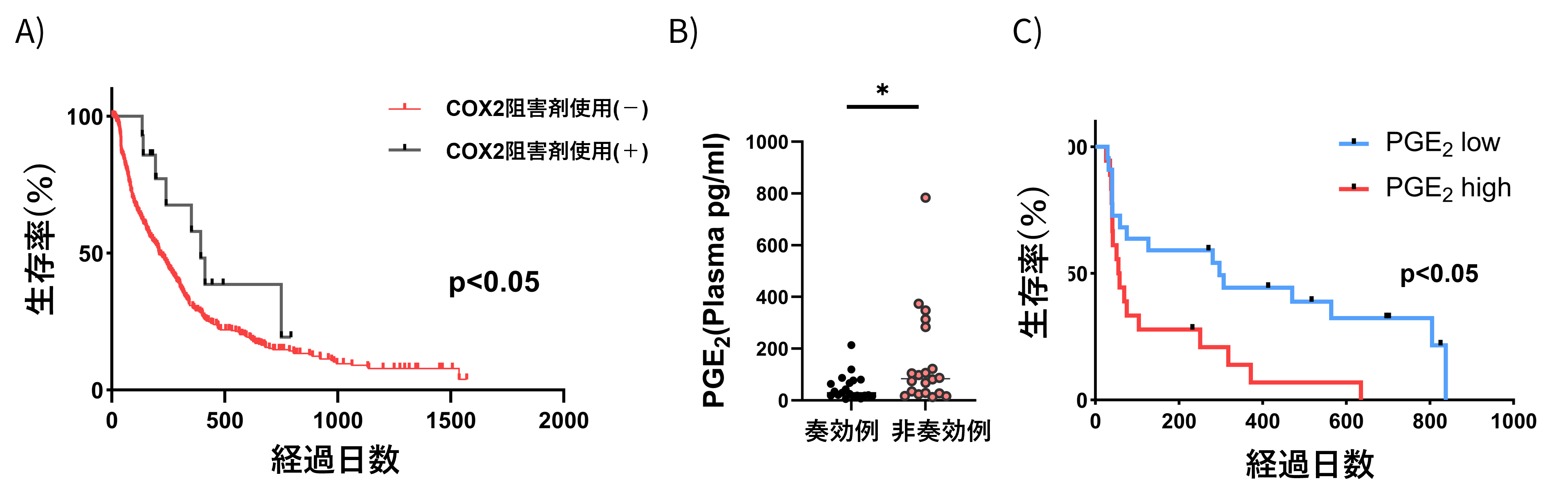 C)血漿PGE2濃度高値例は有意に無憎悪生存期間が短縮した*p<0.05