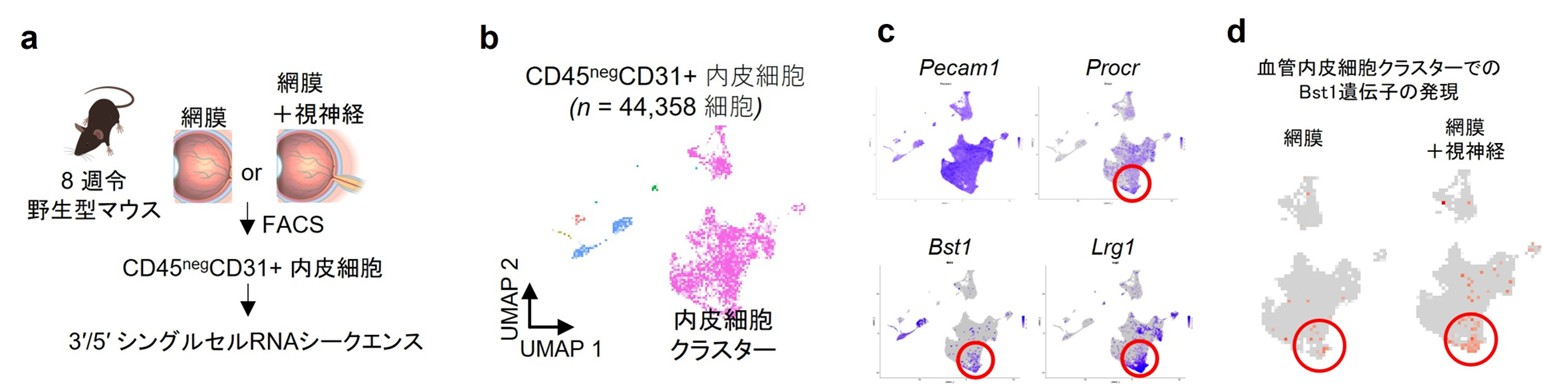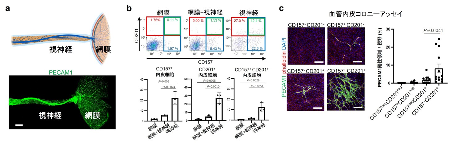 研究グループは、マウスを用いて、血管内皮の幹/前駆細胞の目印として知られる細胞表面マーカー(CD157/Bst1、CD201/PROCR)に着目し、網膜および視神経に存在する血管内皮細胞を解析しました。