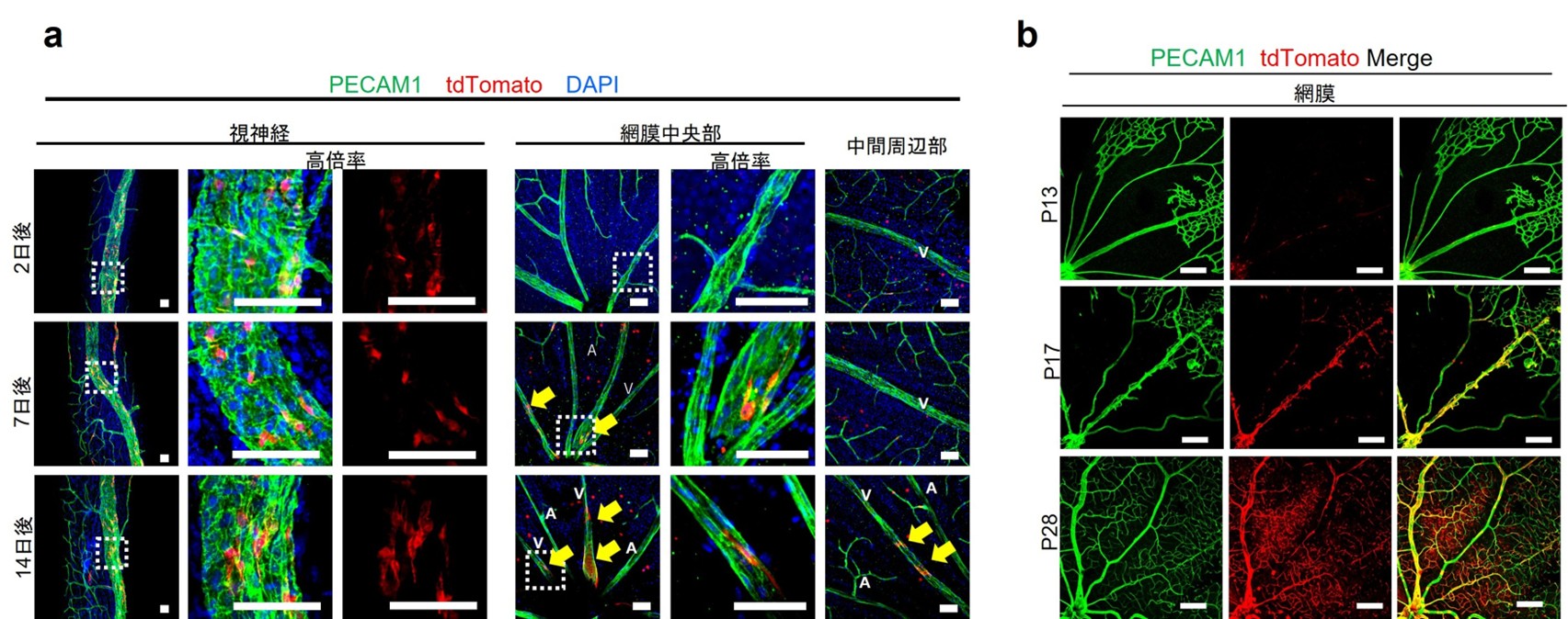 7日後には網膜中央部の静脈、14日後には周辺部静脈までtdTomato陽性細胞を認めた。