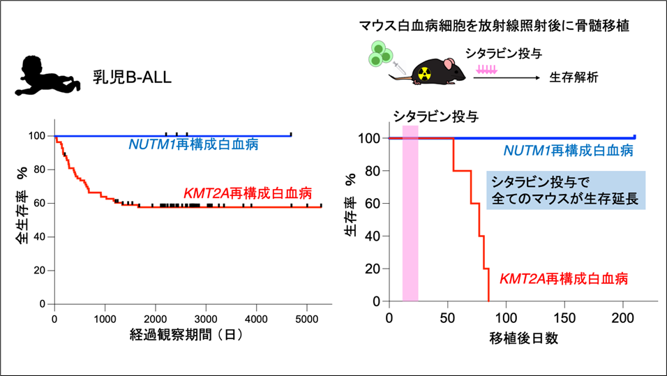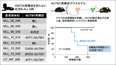 本研究では、NUTM1融合遺伝子が、B細胞系列への分化を促進すると同時に、強い白血病幹細胞性を付与するという二重のがん化機構を持つことを発見しました。さらに、代表的な融合遺伝子をマウスで発現させることで、ヒト乳児白血病を忠実に再現する白血病モデルの構築にも成功しました。このマウスを用いた生体試験では、白血病幹細胞が休眠状態に逃げ込まず、常に活発な増殖プログラムに依存しているという本疾患特有の脆弱性に起因することが分かり、本白血病が化学療法に高い感受性を示す分子学的理由を明らかにしました。