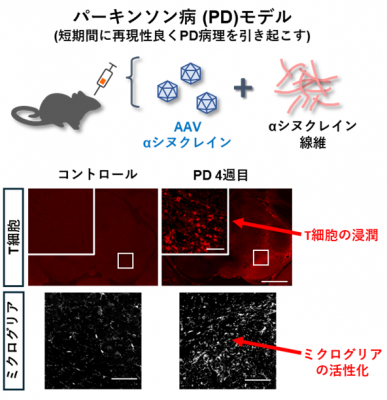 そこで本研究では、αシヌクレイン病態を短期間に誘導できる動物モデルを用いて、ミクログリアとT細胞の反応がどの順序で生じ、病態とどのように関連するかを検証しました。