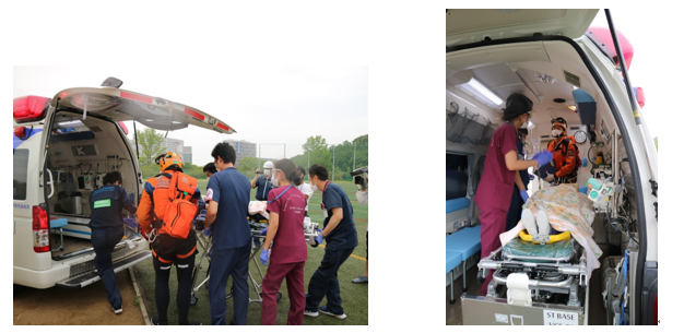 吹田キャンパスグラウンドに海上保安庁のヘリコプター(MH918しらさぎ)が着陸し、阪大病院のドクターカーと吹田消防の救急車に、患者を引き継ぎ、阪大病院の高度救命救急センターへ搬送されました(写真2~10)。本訓練の実施を通じて、当該活動に係る組織体制の機能と実効性に関する検証を行うとともに、大阪大学医学部附属病院と第五管区海上保安本部、吹田市消防本部との相互協力の円滑化を図りました。