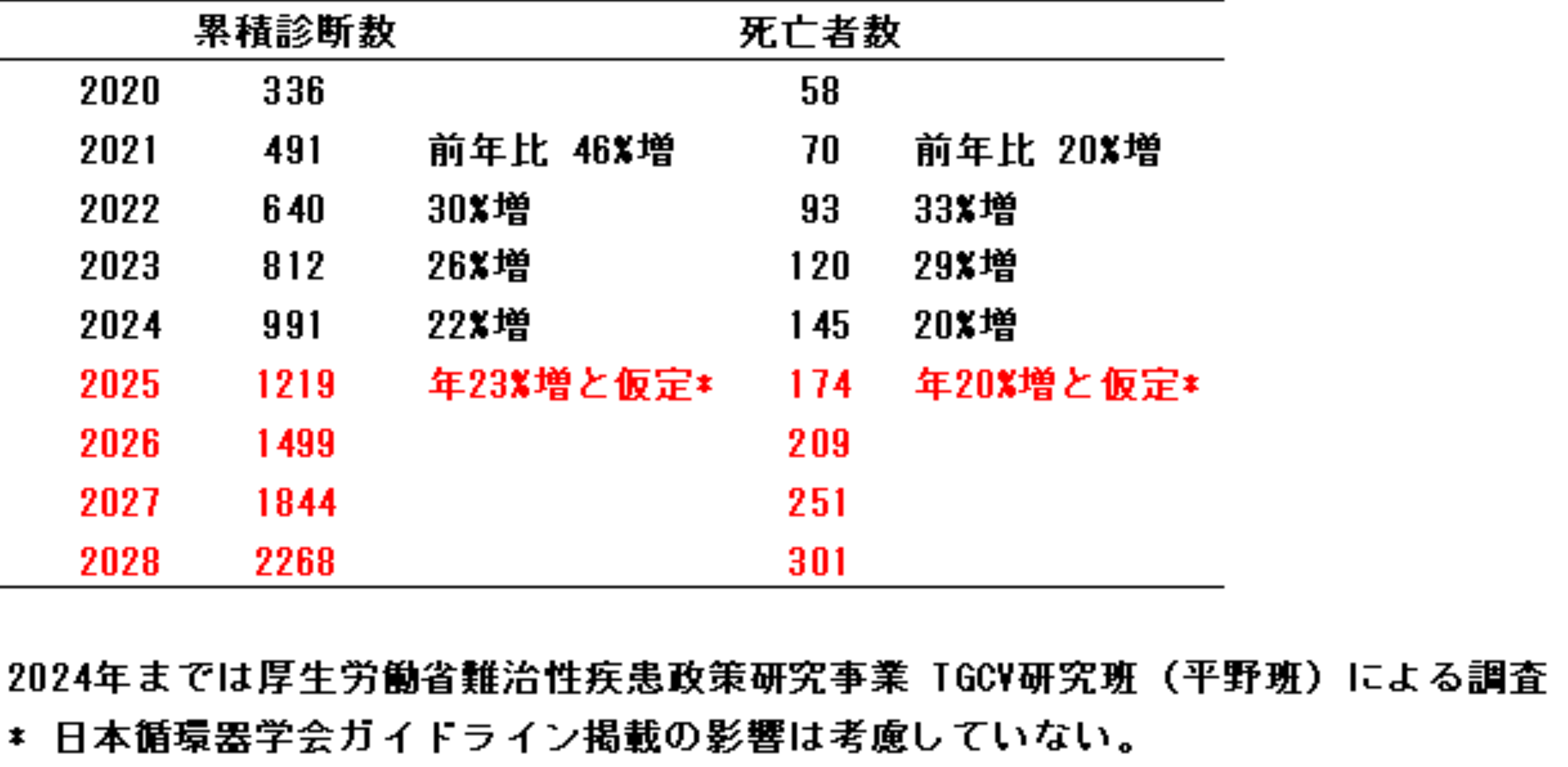 また、TGCVの診断体制は全国レベルで確立したことから顕在患者数が増加しているところ、承認された治療薬が存在しないため、患者は治療抵抗性の心症状に苦しみ死亡者数が増加しています(図1)。