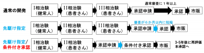 最近では、検証的試験以外でTGCV患者会と共同で実施した臨床研究により、トリカプリン・トリスデカノイン含有食品摂取患者における顕著な長期生命予後の改善が示されました(本学より2025年2月19日にプレスリリース)。これらより、CNT-01の主成分を含む栄養療法の効果が顕著であることが明らかとなりましたが、偽薬対照で心血管イベントを評価する検証的試験は被検者保護の観点から倫理的に困難であると判断し、独立行政法人医薬品医療機器総合機構(PMDA)と条件付き承認制度(図2)への該当性について相談を開始しました。