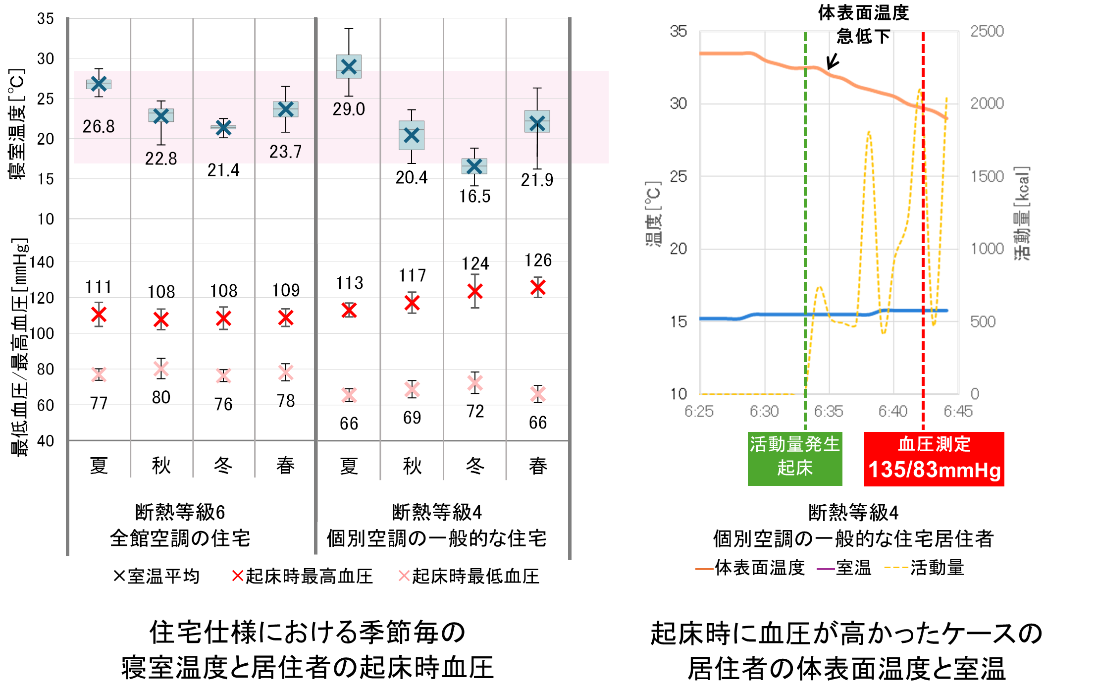 本研究では、断熱性能や空調方式の異なる4世帯(計8名)を対象に、2024年7月から2025年6月までの1年間、室温・湿度、血圧、体表面温度などを測定し、季節変動や起床時の血圧変化との関連を調査しました。その結果、部屋ごとに空調する一般的な住宅では、秋季や冬季に室温が18℃を下回る時間帯があり、血圧が上昇するケースが見られました。一方、全館空調を備えた高断熱住宅では室温が安定し、血圧の季節変動が小さい傾向が確認されました。また、冬によく観察される起床時の血圧上昇は、寝床内と室内の温度差が大きいことで、起床時に体表面の温度が急激に下がることと関係しており、寝床内温度と室温の差が小さい住宅では、朝の血圧変動を抑えられる可能性が示唆されました。