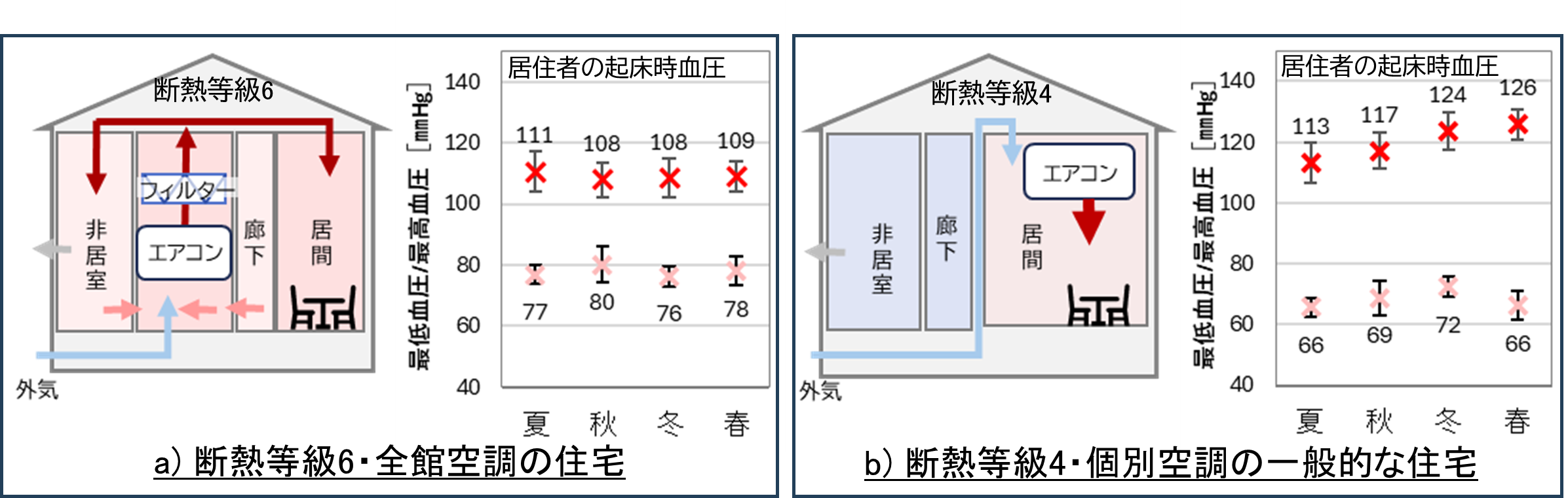 図1: 居住者の住宅仕様と季節毎の起床時血圧の測定値