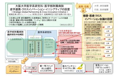 大阪大学大学院医学系研究科、医学部附属病院では、2015年12月に「産学連携・クロスイノベーションイニシアティブ」を立ち上げ、「大阪大学 健康・医療クロスイノベーション会議」の開催のほか、多様な分野の先進的な企業・機関との包括的な連携を推進しています。そして、健康・医療分野におけるイノベーションの実現に向け、組織・分野を越えた多様な連携の推進、人材育成・交流、学術研究の振興と研究成果の事業化、社会活用の推進を図ることを目的とし、多様な先進的な企業・機関と「研究・事業化連携の推進に関する協定書」(包括連携協定)を結んでおります。