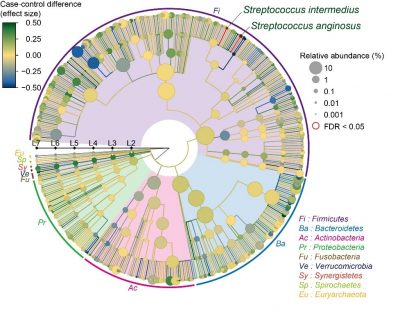 Figure2 :Result of the case–control comparison of the microbial taxa is indicated as a phylogenetic tree. Streptococcus anginosus and Streptococcus intermedius increased in the SLE patients, with a false discovery ratio < 0.05.