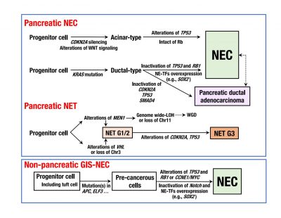 Figure3 : Schematic diagram of genomic alterations involved in the genesis of pancreatic neuroendocrine carcinoma, pancreatic neuroendocrine tumor, and non-pancreatic neuroendocrine carcinoma of the gastrointestinal system. NE-TFs, neuroendocrine differentiation transcription factors.