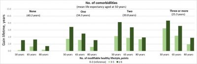Figure 2. Estimation of lifetime gains at the age of 50, 65, and 80 years according to the number of modifiable healthy lifestyles among patients with none, single, double, and triple or more comorbidities.