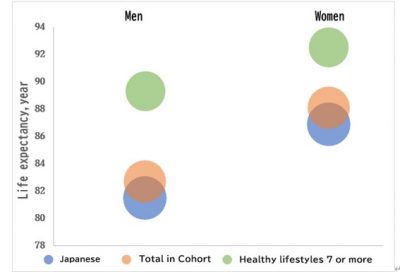 Publish Age and Ageing Researchers from Osaka University find that changing lifestyle behaviors can have a marked effect on lifespan, even for individuals with chronic health conditions Idioms and proverbs about the importance of maintaining good health span the ages. Many emphasize how closely health is tied to happiness and the opportunity to live a fulfilling and enjoyable life. A study published this month in Age and Ageing by The Japan Collaborate Cohort (JACC) Study group at Osaka University assessed the impact of modifying lifestyle behaviors on life expectancy from middle age onwards. The researchers found that adopting five or more healthy lifestyle behaviors increased life expectancy even for individuals >80 years of age and, importantly, including those with chronic conditions. Lifespan is dependent on social factors such as socioeconomic status, policy factors such as assisted access to healthcare, and lifestyle factors like diet and exercise. The current study used a baseline survey from the JACC study, a large research project of 49,021 individuals conducted from 1988 to1990 in 45 areas of Japan. The aim was to increase knowledge about what factors contribute to death from cancer and cardiovascular disease; thus, the questionnaire included components such as diet, exercise, alcohol intake, smoking status, sleep duration, and body mass index. Points were given for each healthy behavior and the impact of modifying these lifestyle behaviors on projected lifespan was assessed. The study continued until December 2009, by which time 8,966 individuals had died. The study’s primary author, Dr. Ryoto Sakaniwa said. “The results were very clear. A higher number of modified healthy behaviors was directly associated with a lower risk of mortality for both men and women.” The lifetime gains were highest for reducing alcohol intake, not smoking, losing weight, and increasing sleep, adding up to 6 years of life for healthy 40-year-olds. This benefit was prominent even among older individuals (80 years or more) and those with one or more major comorbidities including cancer, cardiovascular disease, hypertension, diabetes, and kidney disease, and in each life stage from middle age onwards. “This is a particularly important finding given that the prevalence of chronic disease has increased globally and is a major cause of death in older populations,” says Senior author, Dr. Hiroyasu Iso. This is one of the first studies to measure the impact of improvements to health behavior among older individuals in a country with a national life expectancy achieving alomost 85 years. The finding that lifestyle improvements has a positive impact on health despite chronic health conditions and older age is an empowering one, especially given the increasing prevalence of chronic conditions and longer life. The findings of this study will contribute to the design of future healthcare settings, public health approaches, and policies that work in partnership with patients to promote healthy lifestyle choices. ### The article, “Impact of modifiable healthy lifestyle adoption on lifetime gain from middle to older age” was published in Age and Ageing at DOI: https://doi.org/10.1093/ageing/afac080 Summary: Researchers from Osaka University show that making healthy lifestyle choices relating to diet, exercise, alcohol intake, smoking status, sleep duration, and weight management result in a longer lifespan. The benefits of healthy choices were also seen among older individuals and those with one or more serious chronic health conditions. These findings will help inform the development of healthcare practices and policies that educate patients about the benefits of making healthy lifestyle choices. Tweet 1: Beat the Reaper by making healthy lifestyle choices and add years to your life – even if you have a chronic illness Primary Keyword: Medicine/Health Method of Research: Observational study Subject of Research: People Title: “Impact of modifiable healthy lifestyle adoption on lifetime gain from middle to older age” Funded by: Japan Society for the Promotion of Science, Ministry of Education, Culture, Sports, Science and Technology of Japan