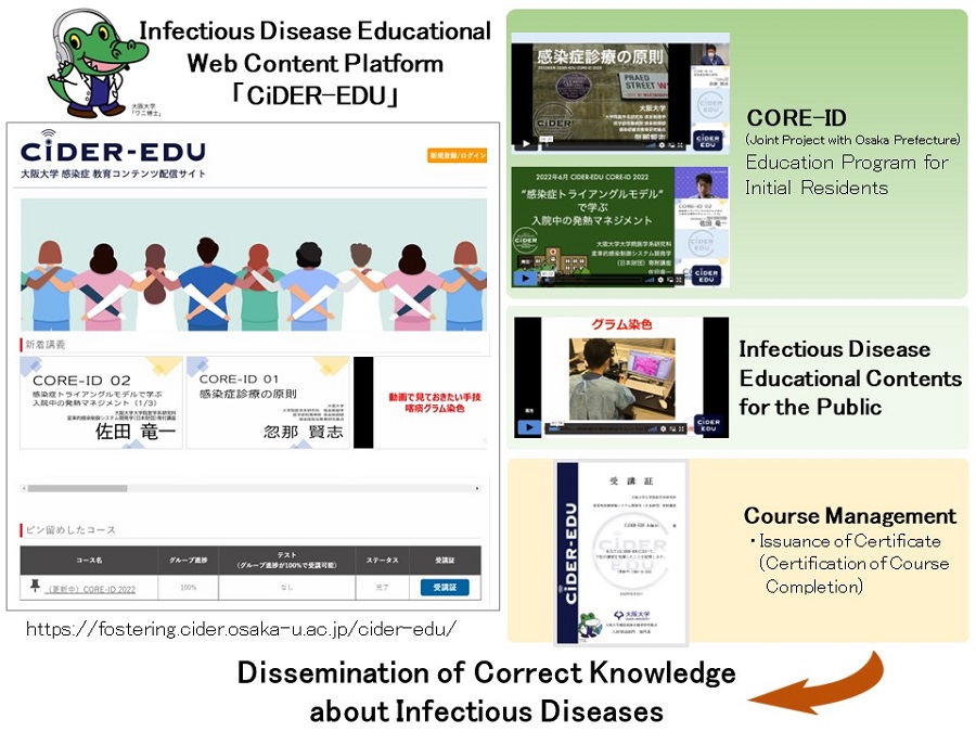 In our course, we aim to provide an opportunity of learning correct knowledge about infections “to anyone, anywhere, and anytime” by establishing a platform to deliver educational contents to provide a wide range of technologies and knowledge required for future infection control settings as well as accurate medical information on infections. At present, “CiDER-EDU” is launched as an educational web contents platform, where an infection training program “CORE-ID” for initial residents is distributed jointly with Osaka Prefecture.