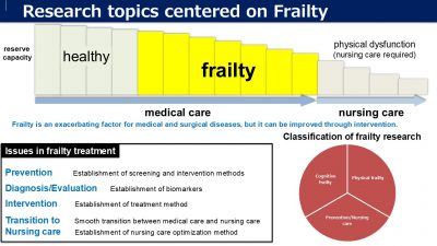 The mission of geriatrics is to provide medical care and nursing care for elderly people so that they can happily fulfill their lives including the extension of healthy life expectancy. Frailty is an important intervention point for this mission. Frailty is a clinical condition of diminished reserve capacity of elderly people between the healthy state and the state requiring nursing care. Frailty can be improved to a healthy state by intervention and is a turning point from medical care to nursing care. Therefore, it is necessary to elucidate the mechanism, and evaluate and intervene in frailty. Frailty is classified into physical frailty (frailty, sarcopenia, etc.) and cognitive frailty (MCI, dementia, etc.). In our laboratory, we conduct research mainly on frailty, such as elucidation of the mechanism of frailty, development of evaluation and treatment methods, prevention of frailty, and optimization of care during the transition period to long-term care.