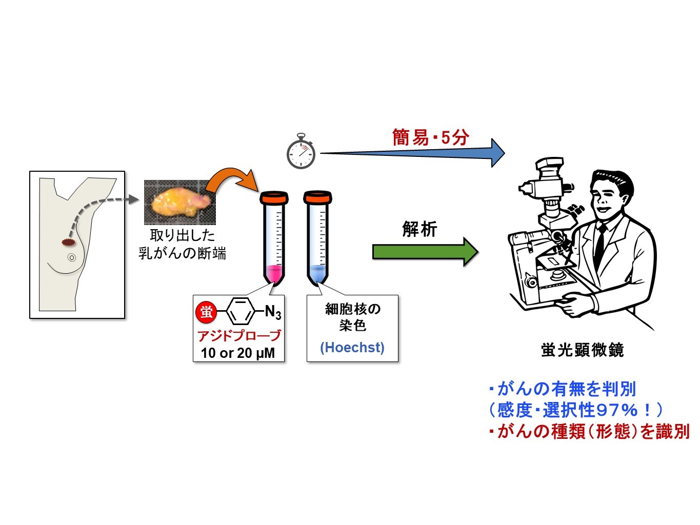 現在、乳がんの乳房温存手術の際、術中に乳腺断端組織の顕微鏡による診断(術中迅速病理組織診断)を行い、がんが残っていないかどうかを確認しています。断端検査には一般的に数十分程度を要する為、短時間で簡便に実施できる新しい迅速術中診断技術を開発することが求められています。我々は、酸化ストレスの多い細胞(がん細胞など)で高発現するアクロレインに有機反応を起こして細胞に取り込まれるプローブを見いだし、手術中に摘出した“生”の乳がん組織に5分間浸すだけで、がん細胞が迅速に染色されることを見つけました(click-to-sense法)。このプローブは病理診断とほぼ同じ結果のがん組織の画像形態を確認することができます。がん細胞は細胞レベルで染色される為、捺印細胞の診断にも期待されており、現在、我々は、この技術と人工知能(AI)の画像診断技術との併用を用いて乳がん手術の際の乳腺切除断端の術中迅速診断に用いられることを目指しています。