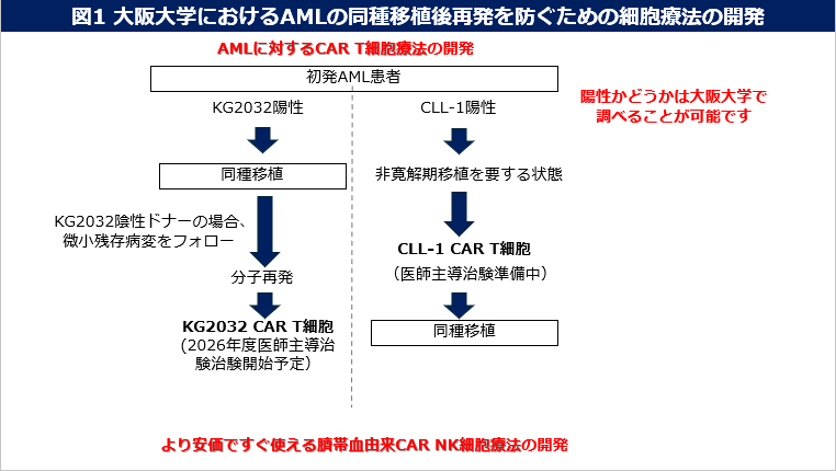 大阪大学血液・腫瘍内科では急性骨髄性白血病(AML)に対する新しいCAR T細胞療法を開発しています(図1)。