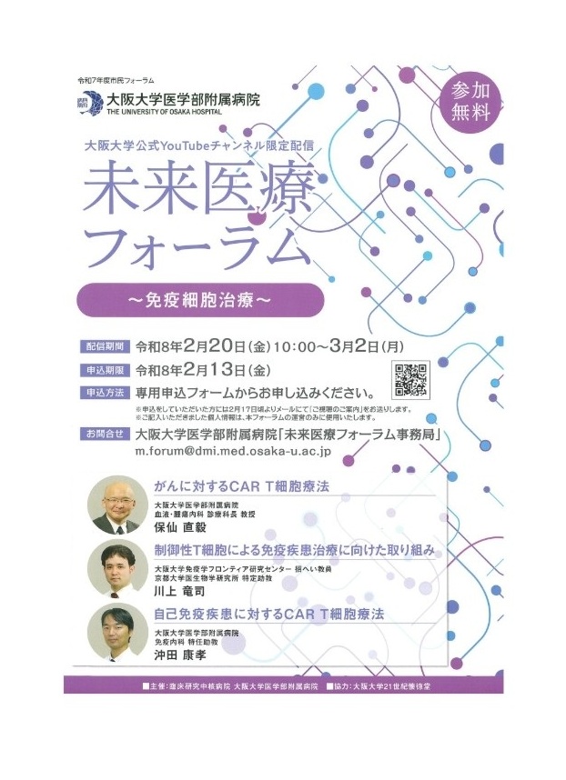令和7年度 市民フォーラム 「未来医療フォーラム 〜 免疫細胞治療 〜」をオンラインにて開催中です! 大阪大学