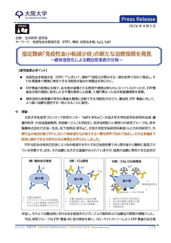 保仙直毅教授、中田継一先生、柏木浩和招へい教授らの研究グループは、中外製薬株式会社の大浪一生氏、松下浩明氏(IFReC、大阪大学医学系研究科兼務)らとの共同研究で、免疫性血小板減少症(ITP)において補体活性化が関与する一群を世界で初めて見出し、それを実臨床で簡便に検出できる可能性がある検査法を明らかにしました。