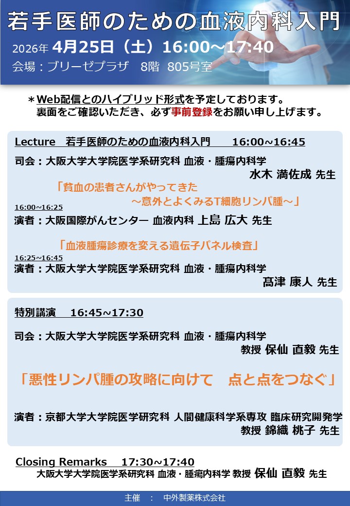 ■Lecture 若手医師のための血液内科入門 16:00~16:45 司会:大阪大学大学院医学系研究科 血液・腫瘍内科学 水木 満佐成 先生 「貧血の患者さんがやってきた 「血液腫瘍診療を変える遺伝子パネル検査」 ■特別講演 16:45~17:30 司会:大阪大学大学院医学系研究科 血液・腫瘍内科学 教授 保仙 直毅 先生 「悪性リンパ腫の攻略に向けて 点と点をつなぐ」 ■Closing Remarks 主催:中外製薬株式会社 |