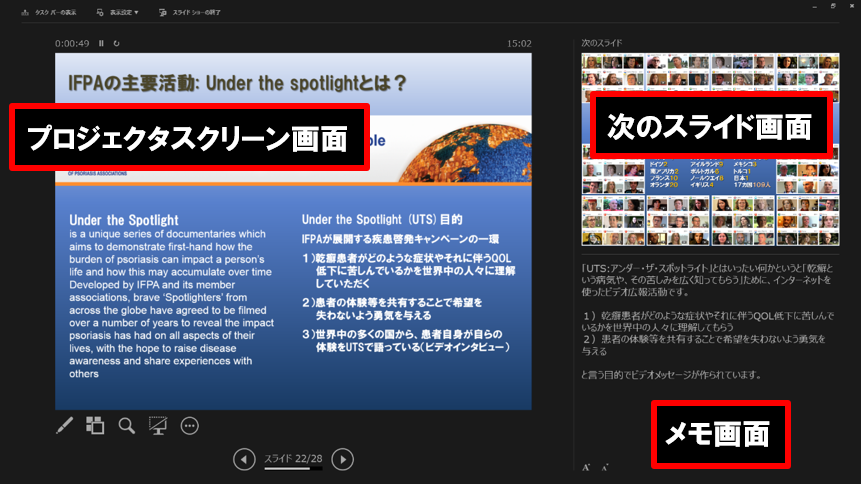 | 演者席の画面です。スクリーンには参加者向けのメモのないプレゼンテーションが表示されます。 |