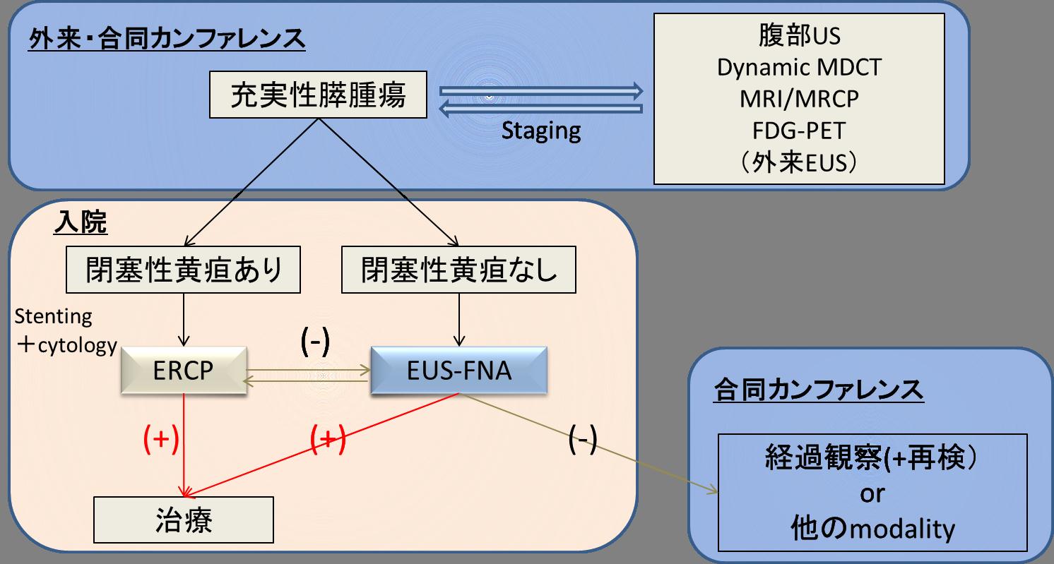 | 研究目的 | 現在当院では下記診断プロトコルに従い、充実性膵腫瘍の診断を行っている。充実性膵腫瘍に対する病理学的診断法として、閉塞性黄疸を伴う症例はERCPを、伴わない症例はEUS-FNAを施行している。この診断プロトコルの安全性と有用性について前向きに観察研究を行うことを目的とする。
