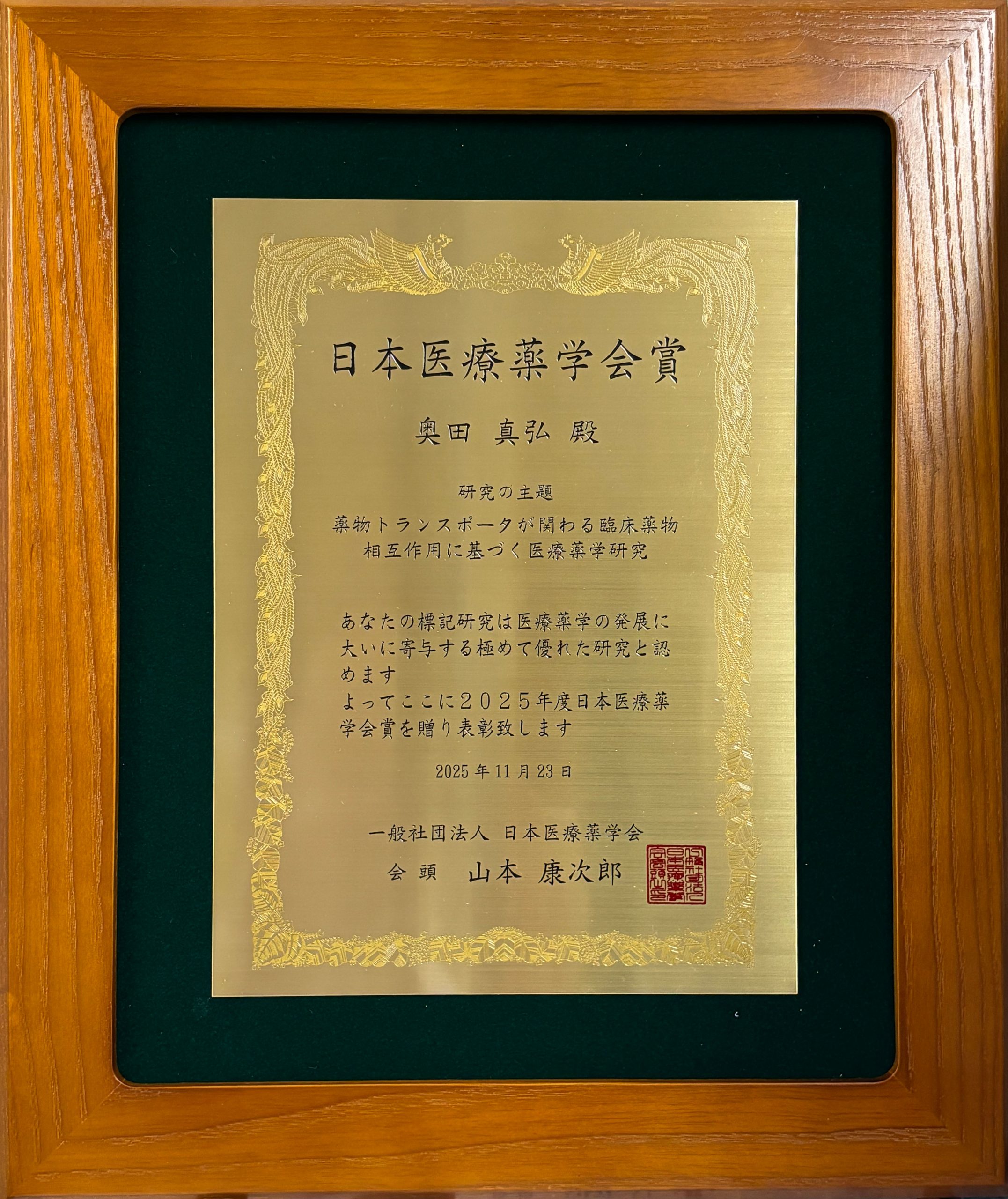 受賞 奥田真弘 教授・薬剤部長が2025年度日本医療薬学会賞を受賞しました 2025年11月23日 奥田 真弘 2025年度日本医療薬学会賞 薬物トランスポータが関わる臨床薬物相互作用に基づく医療薬学研究