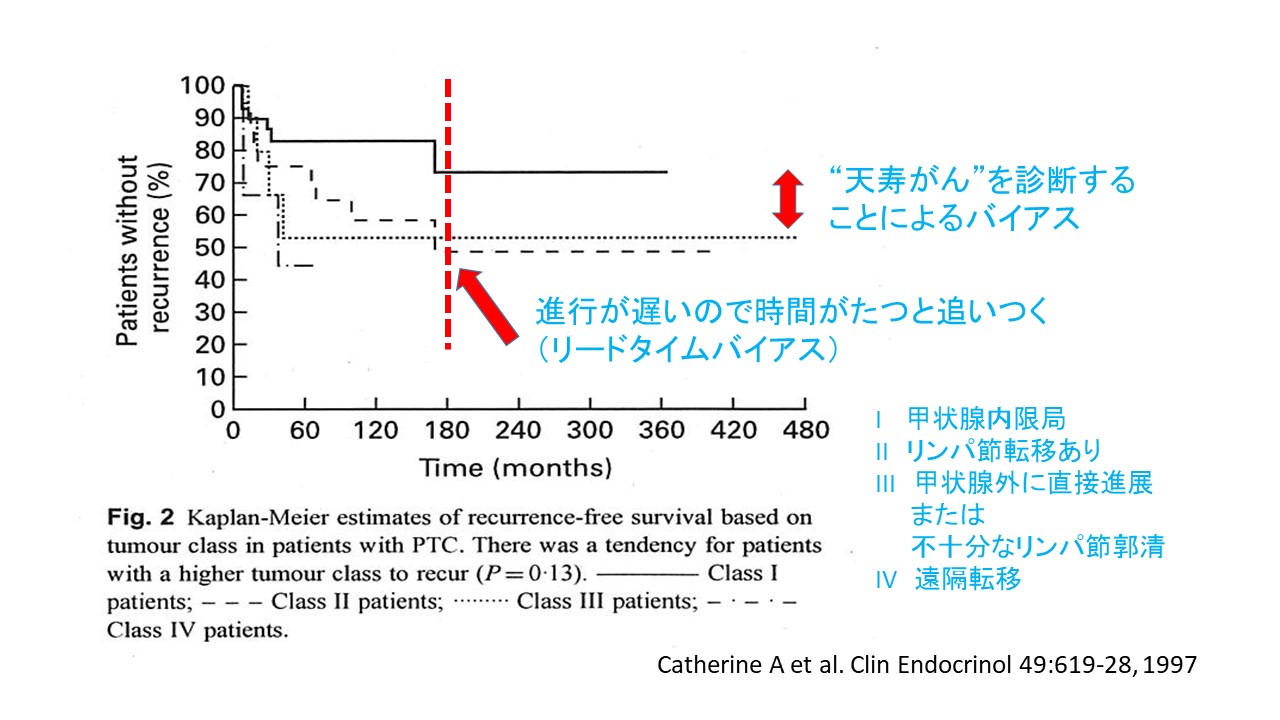 まず、資料4−2ですが、発見時に進行している患者ほど、再発率が高い、とするデータの提示になっています。この事実は確かですが、がん検診としての有効性を考えるには、甲状腺がんの特性を考慮しなければなりません。甲状腺がんは1)一生涯患者に悪さをしない”天寿がん”の頻度が高い、2)進行が極めて遅いので、かなり遅れて再発をきたすことによるリードタイムバイアスが生じやすい、という特徴があります。データを見るときはこのようなバイアスが否定できるか、ということを必ず見なくてはいけません。代表的な例を挙げます。下の図は若年者の甲状腺がんの再発率のデータです。確かに、進展している症例ほど再発率が高い時期があります。しかし、II〜IVは15年経過すると再発率がほぼ同じになってしまいます。すなわち、最終的な再発率は変わらないのですが、IIは発見時腫瘍がまだ小さいので、再発がわかるようになるまで時間がかかるだけなのです。これがリードタイムバイアスです。またIの症例は多くの天寿がんの症例を含みます。これらは一生涯再発しないので結果として見かけ上Iの群は経過が良いように底上げされて見えます。超音波スクリーニングの有用性を証明するためには、これらのバイアスの可能性が無いデータを提示する必要があります。