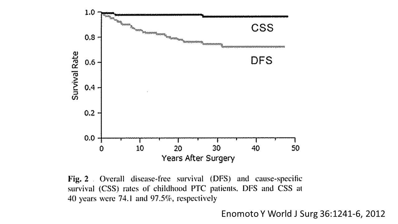 アメリカ甲状腺学会のホームページでは小児甲状腺がんの予後については「20−30年の経過で生存率95%以上」としています。実はこの「95%”以上”」というのには訳があり、数十年という長期では追跡が困難であり、特に経過の良い患者は観察を中止されている例がどうしても増えてきます。ですから、実際の予後は95%より高いはずなのです。