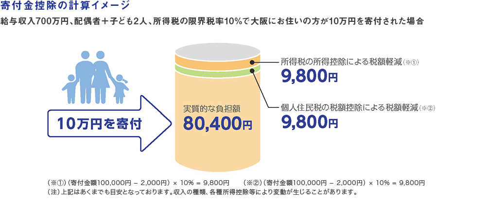 吹田市・豊中市・茨木市・箕面市にお住まいの方は、寄附金の額(当該年分の総所得金額等の30%を限度とする。)から2,000円を除いた額に10%(都道府県民税4%・市区町村民税6%)を乗じた額が、翌年の個人住民税から控除されます。