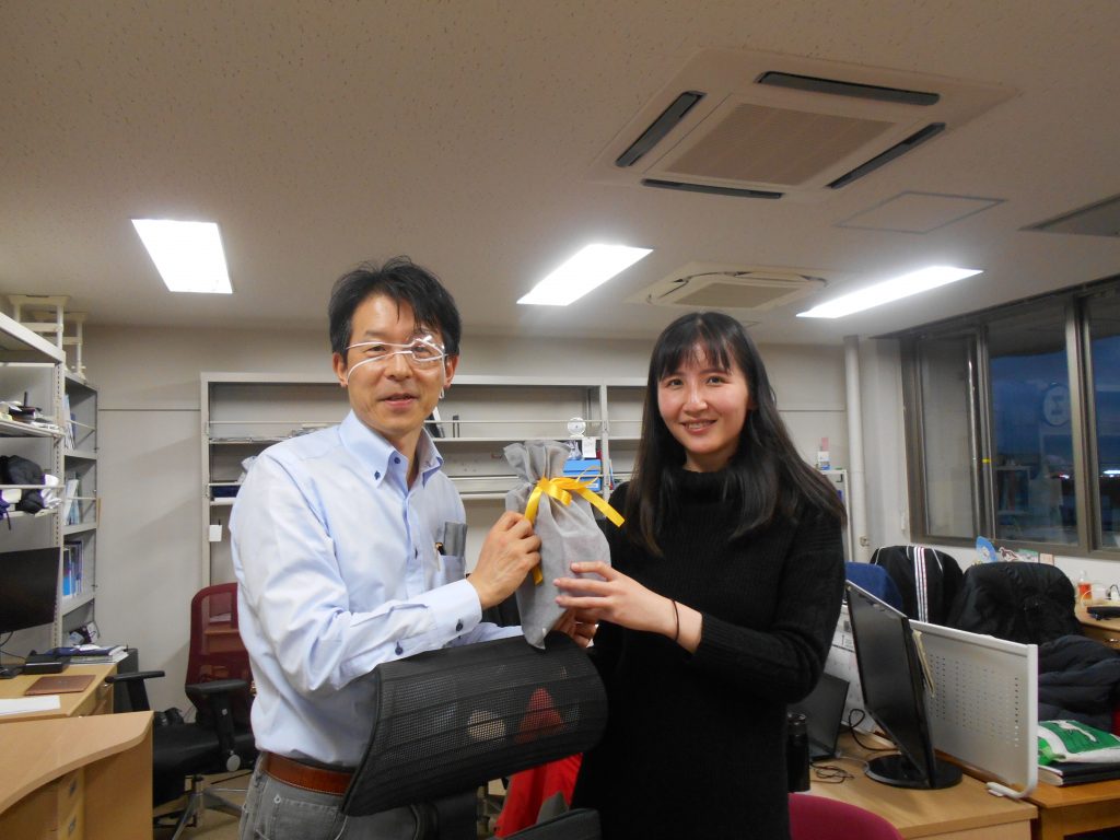 残念ながら雨の日の大掃除となりましたが実験台や棚はもちろん、窓拭きや換気口なども一年の汚れを落としました。掃除が終わった後は、今年で研究室を離れる博士課程学生の李さんへのプレゼントを準備してとクリスマス会をしました。