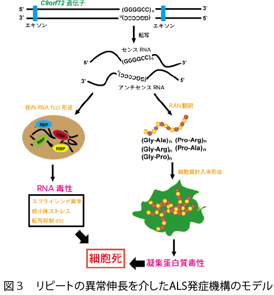 河原はこれまで神経内科医として、アルツハイマー病、パーキンソン病、筋萎縮性側索硬化症 (ALS)、脊髄小脳変性症など多くの神経難病と闘う患者さんと接してきました。現在も、限られた時間の範囲内ではありますが、患者さんの診療を継続しており、自らの研究の方向性を決定付けています。中でも、ALSの病態解明と治療法の確立は、教室のライフワークとなっています。ALSは、運動神経細胞が選択的に脱落し、多くの場合、全身の筋力が数年で失われてしまう難病です。日本には9,000人弱の患者さんがいますが、9割に遺伝性がなく、河原が研究をはじめた頃には限られた情報しかありませんでした。しかし近年の研究技術の飛躍的な発展に伴い多くの知見が得られるに至っています。例えば、 TDP-43やFUSといったRNA結合タンパク質をコードした遺伝子に、しばしばALSと関連した変異が見つかるようになったこと (図2)や、C9orf72遺伝子のイントロン中にあるGGGGCCリピート配列の異常伸長が一部のALSの原因として発見されたことが挙げられます (図3)。これらの知見は、ALSの病態の根底にRNA代謝異常があることを示唆しています。また、これら複数の遺伝子変異が、ALSだけでなく、認知症を主症状とする前頭側頭葉変性症 (FTLD)の原因ともなることが分かってきています。これは、変性しやすい神経細胞の特徴を探る上で極めて重要な手がかりとなります。過去10年間に得られた知見の量と質を鑑みると、今後10年の間にALSの根本的な原因が解明され、治療法の道筋が立てられるかもしれません。そのためにも、従来の既成概念やアプローチ法を打破する必要性があると考えます。