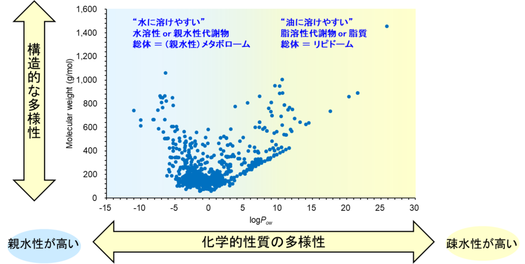 メタボロームは物理化学的性質の範囲が広いという特徴があります。物理化学的性質には、例えば、分子量 (~2,000まで)、極性 (低極性から高極性)、電荷特性 (陽イオン性、両イオン性、陰イオン性、非荷電) や分子の立体構造 (キラリティ) といったものが挙げられます。図には、私たちの研究室で所有している合計715種類の標準品化合物の分子量とオクタノール/水 分配係数 (n-octanol/water partition coefficient, logPow) の値を示しています。分子量からは構造的な多様性が、logPowからは化学的性質の多様性の一端が伺えると思います。これに加え、さらに電荷特性や立体構造の違いなども考慮すると、メタボロームの物理化学的性質の複雑さが実感できるのではないでしょうか。このような物理化学的性質の複雑性が、単一手法でこれら全ての代謝物を測定することを難しくしています。